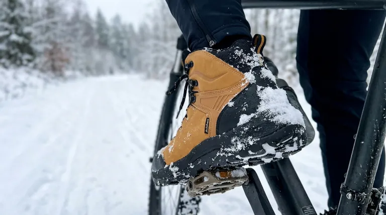 Steife Radschuhe sind für eine maximale Kraftübertragung auf das Pedal ausgelegt. Diese Steifigkeit verhindert jedoch die Beugung des Fußes und reduziert die innere Wärmeerzeugung. Ein flexiblerer Winterstiefel oder ein flacher Schuh ist inhärent wärmer, allerdings auf Kosten einiger Pedaleffizienz.