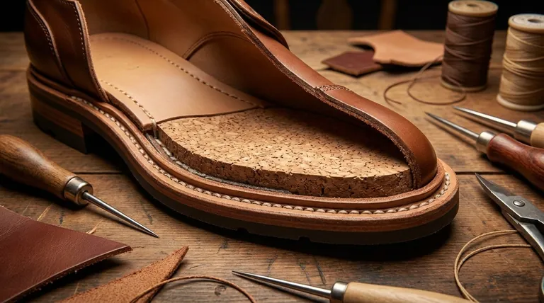Der Rahmen dient als robuste Zwischenschicht oder „Puffer“ zwischen Obermaterial und Sohle. Die gesamte Biegebelastung und der Aufprall beim Gehen werden auf den Rahmen und die Naht der Sohle übertragen, nicht direkt auf das empfindliche Leder des Obermaterials.