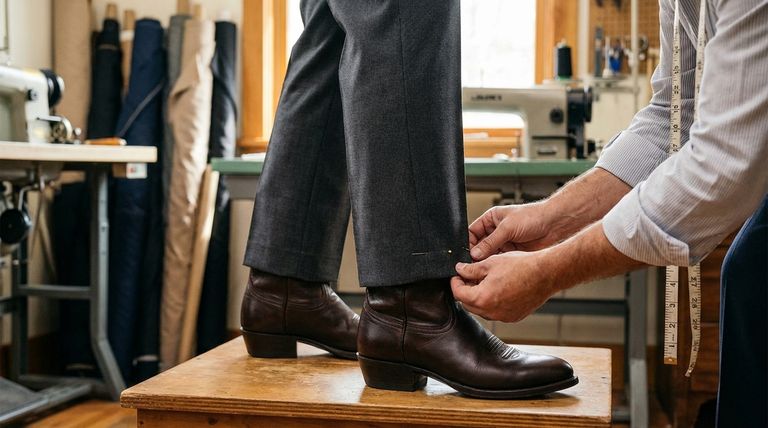 Dies ist der wichtigste Schritt. Die Höhe des Absatzes, die Form des Spanns und die Weite des Schafts variieren erheblich zwischen verschiedenen Stiefeln. Ihr Schneider kann nicht raten; er muss die Hose anhand der spezifischen Stiefel messen, die Sie tragen werden.